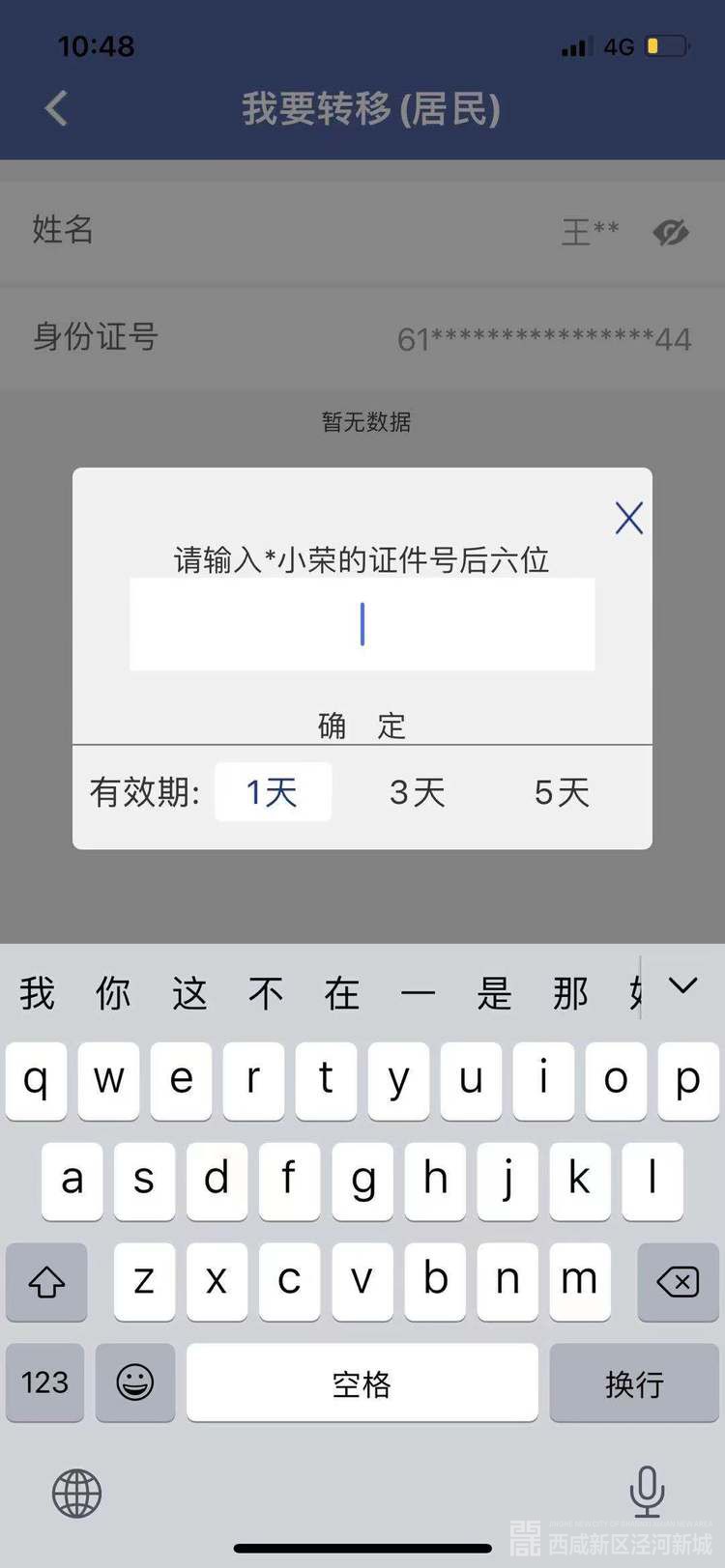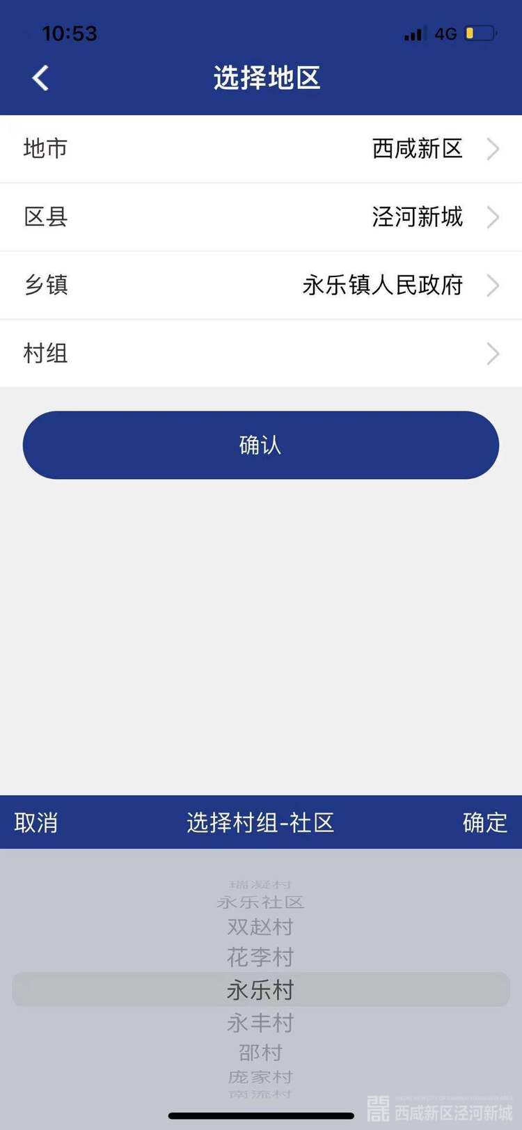 转入永乐镇的用户,地市选择“西咸新区”,县区选择“泾河新城”,乡镇选择“永乐镇人民政府”,村组按照实际情况填写(如图5、图6所示)。