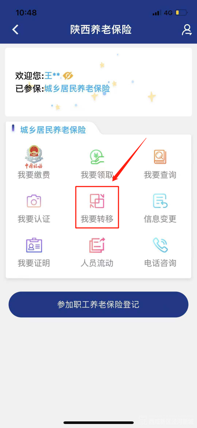 注册登录成功后,点击首页的“业务办理”(如图2所示),出现图3界面,在“城乡居民养老保险”模块,选择“我要转移”,填写身份证号后六位进入转移界面(如图4所示)。
