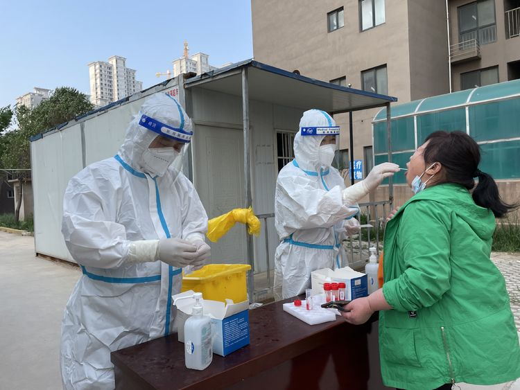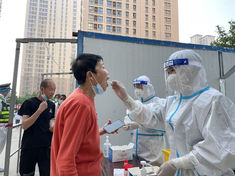放松,嘴巴张开,大声说啊“……”身穿防护服的王峰弓着腰为市民采集核酸。