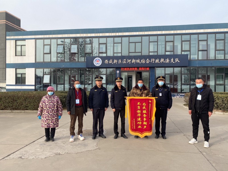 1月17日上午,泾河新城崇文镇崇文便民集中经营区代表将一面写有“为民服务争朝夕,不负韶华建功业”的锦旗送到了泾河新城综合行政执法支队执法人员的手中,充分肯定了执法人员在城市管理中发挥的作用。