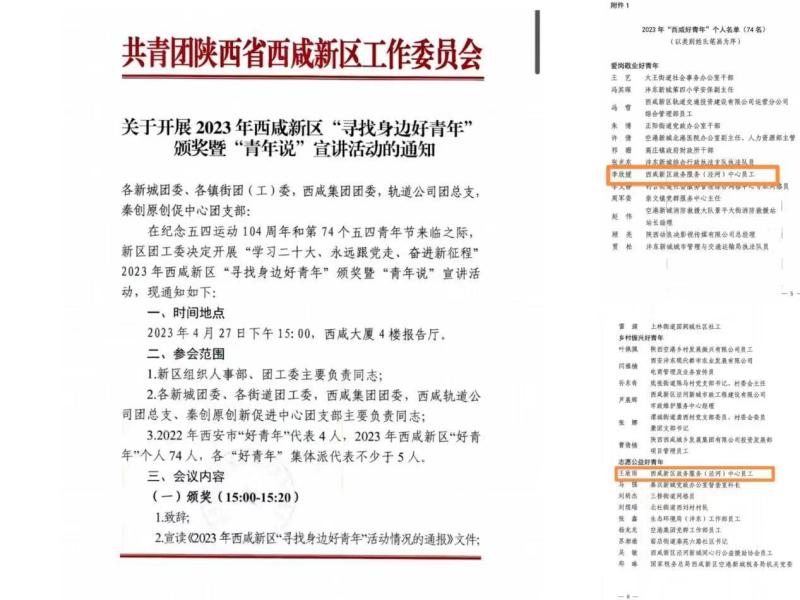 青年,是整个社会中最积极、最有朝气的力量,国家的希望在青年,民族的未来在青年。4月27日下午,由西咸新区团工委主办,主题为“学习二十大、永远跟党走、奋进新征程”的“寻找好青年”的评选活动,经过层层推荐、评审、考察和公示,西咸新区政务服务(泾河)中心王欣雨荣获“志愿公益好青年”称号,李欣媛荣获“爱岗敬业好青年”称号。让我们来看看身边硬核青年榜样们的青春魅力。