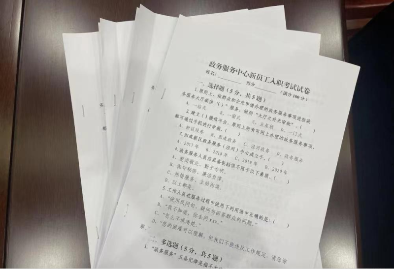 为切实提高泾河新城政务服务工作人员的业务技能和服务效能,打造一支素质高、业务精、服务优的政务服务队伍,更好地适应新时代政务服务发展的需要,5月5日下午,泾河新城政务服务中心组织开展业务知识及行为能力规范考试,以考促学、促能力提升。