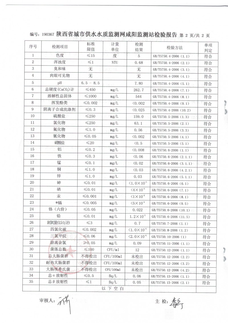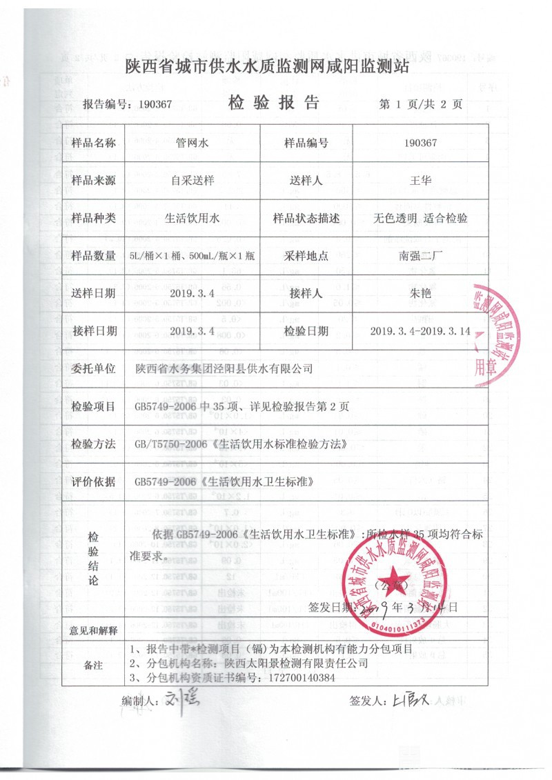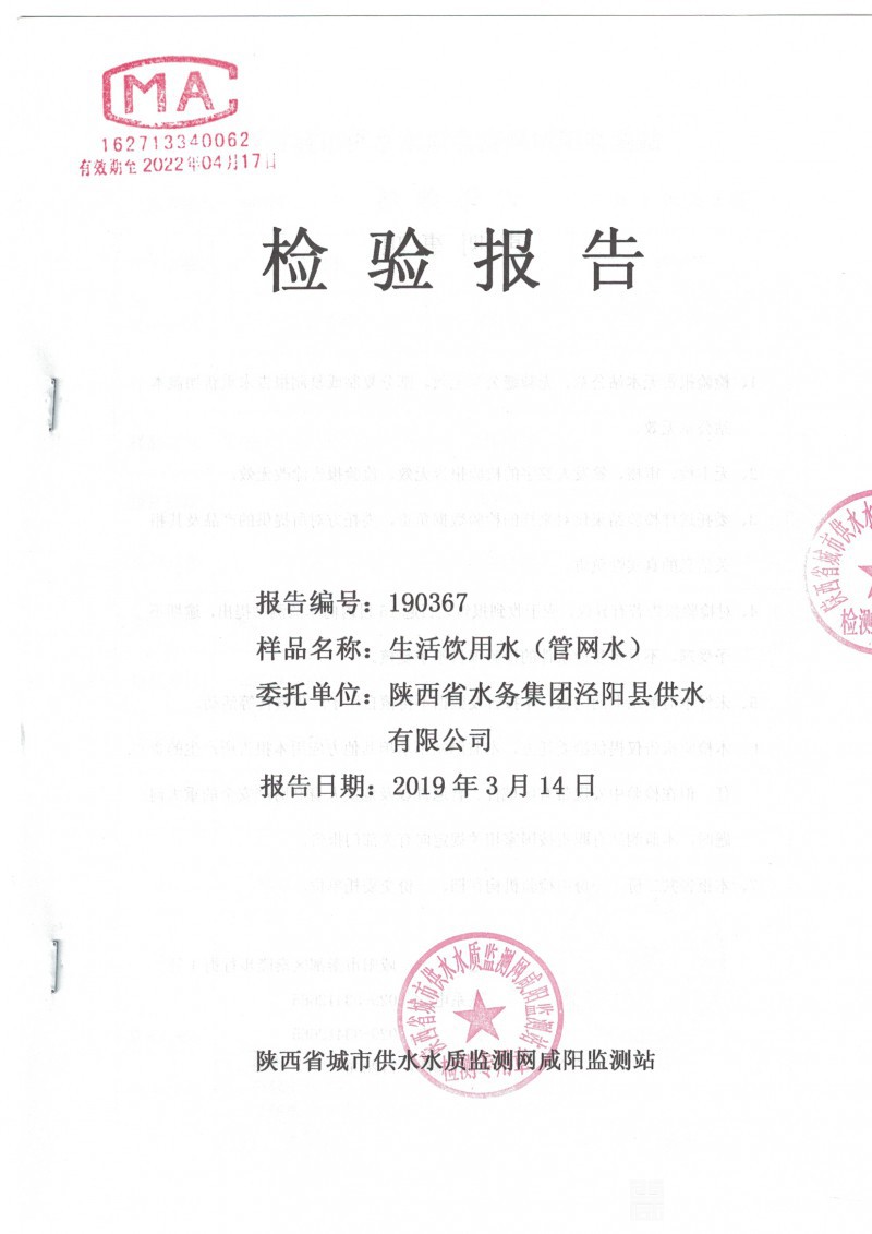 陕水集团泾阳县供水有限公司生活饮用水检验报告(管网水)