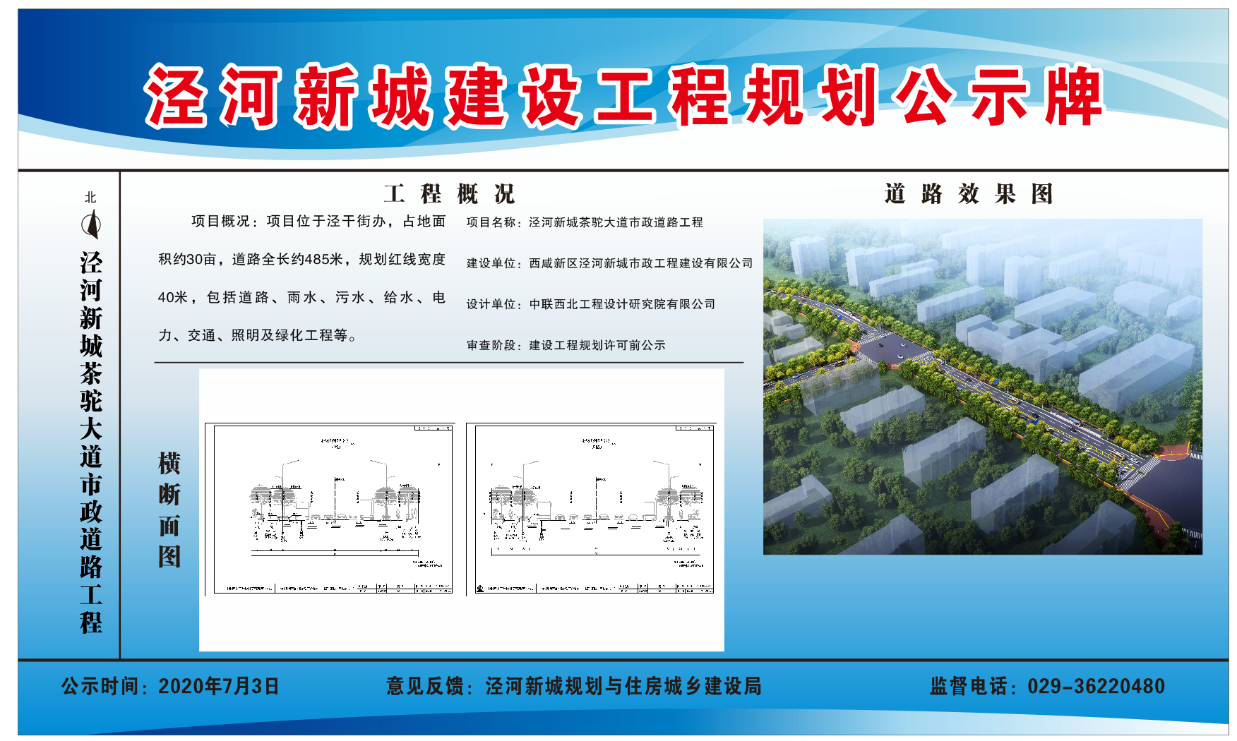 西咸新区泾河新城市政工程建设有限公司茶驼大道市政道路工程已通过设计方案审查,现进行建设工程规划许可批前公示,公示期2020年7月3日至2020年7月9日。如有异议,请于公示期内向规划与住房城乡建设局反馈,监督电话029-36385570。