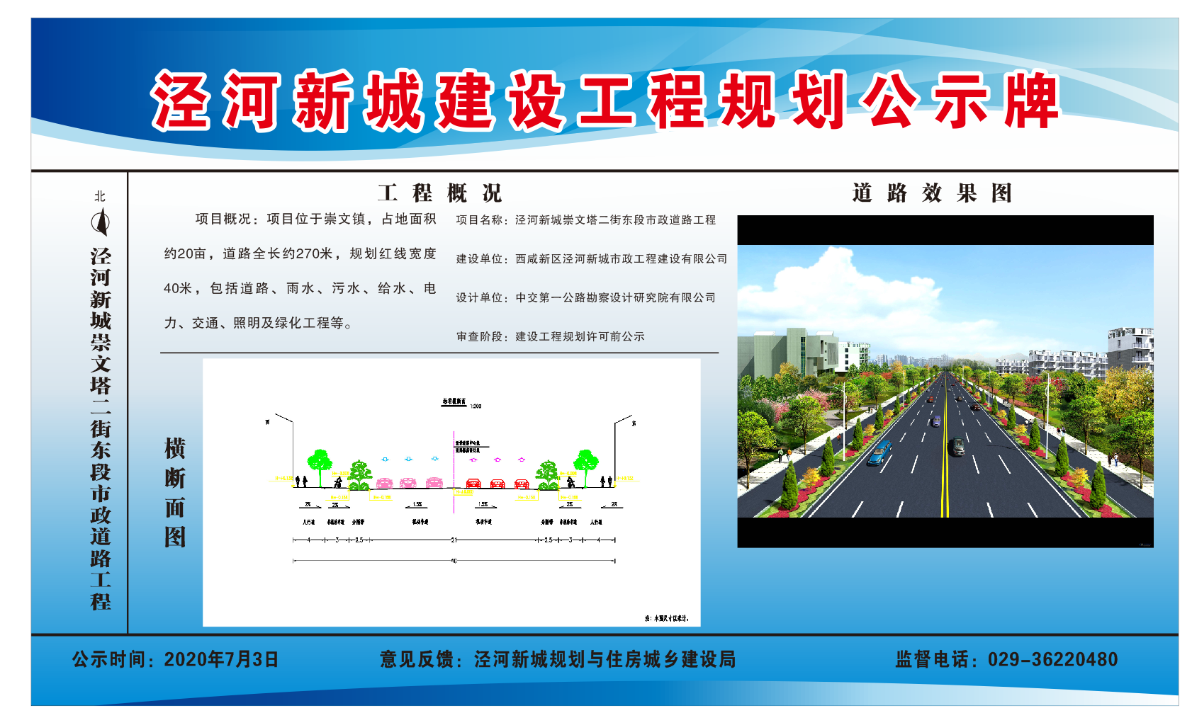 西咸新区泾河新城市政工程建设有限公司崇文塔二街东段市政道路工程已通过设计方案审查,现进行建设工程规划许可批前公示,公示期2020年7月3日至2020年7月9日。如有异议,请于公示期内向规划与住房城乡建设局反馈,监督电话029-36385570。