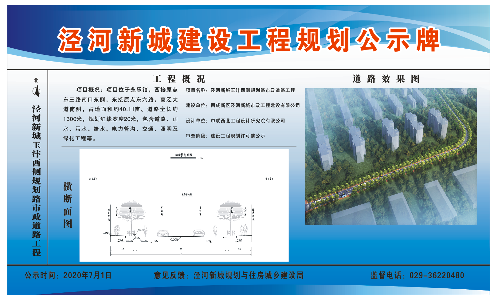 西咸新区泾河新城市政工程建设有限公司玉沣西侧规划路市政道路工程已通过设计方案审查,现进行建设工程规划许可批前公示,公示期2020年7月1日至2020年7月7日。如有异议,请于公示期内向规划与住房城乡建设局反馈,监督电话029-36385570。