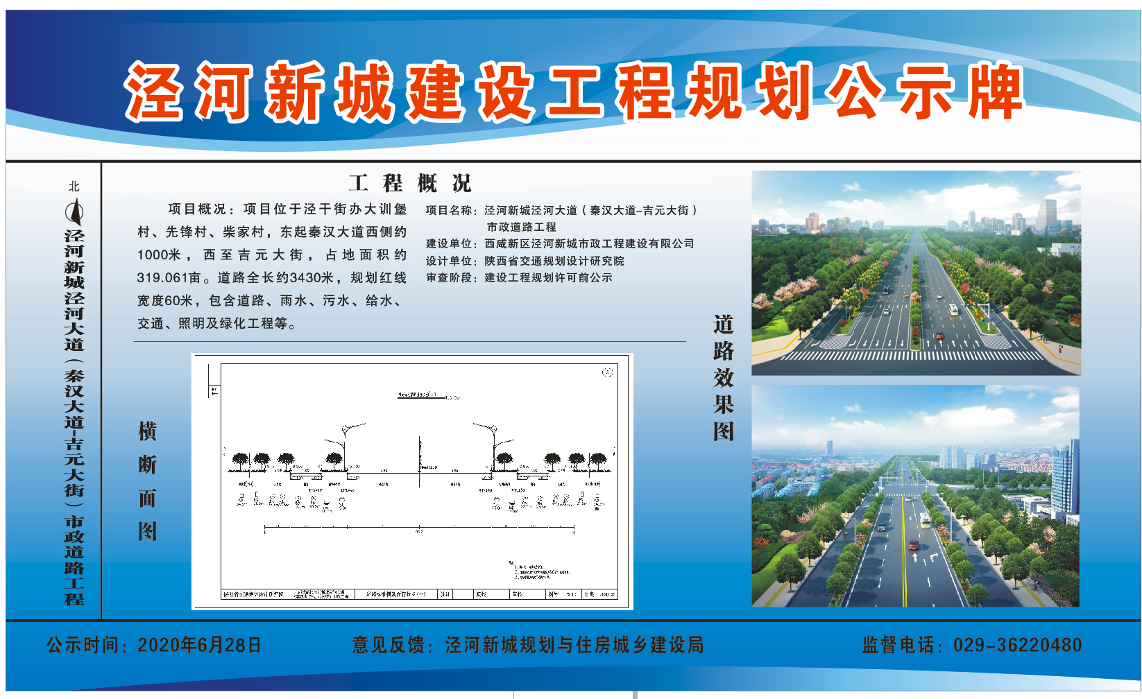 西咸新区泾河新城市政工程建设有限公司泾河大道(秦汉大道-吉元大街)市政道路工程已通过设计方案审查,现进行建设工程规划许可批前公示,公示期2020年6月28日至2020年7月4日。如有异议,请于公示期内向规划与住房城乡建设局反馈,监督电话029-36385570。