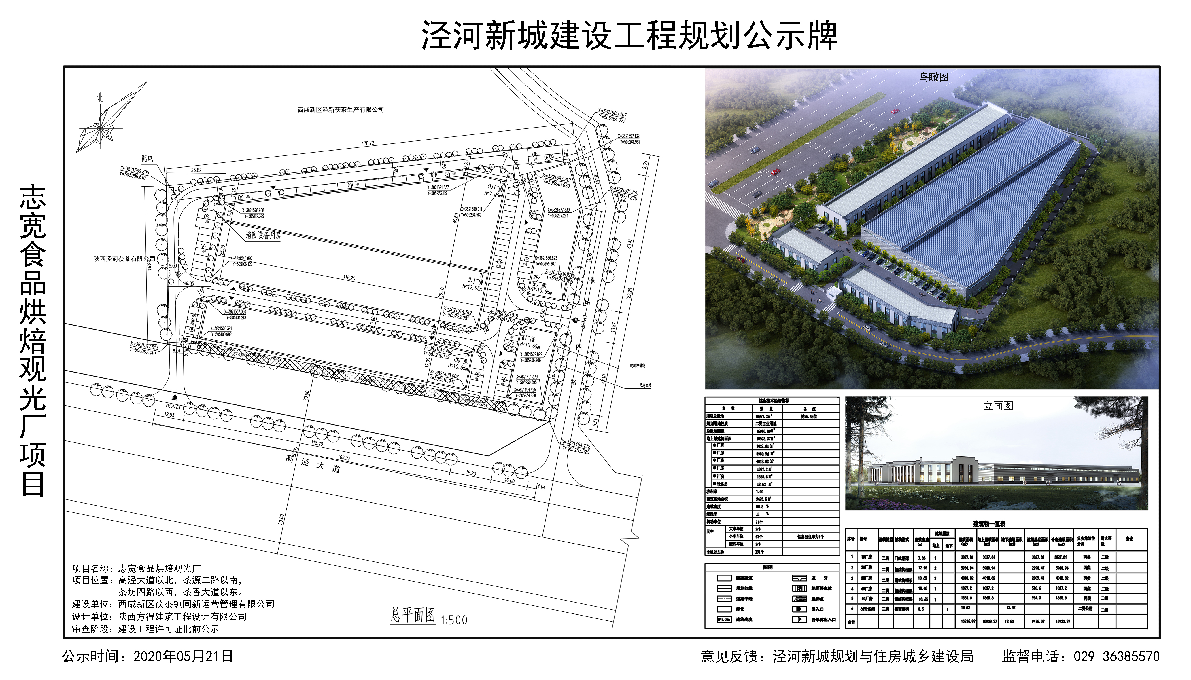 西咸新区茯茶镇同新运营管理有限公司志宽食品烘培观光工厂项目已通过建筑设计方案审查,现进行建设工程规划许可批前公示,公示期2020年5月21日至2020年5月27日。如有异议,请于公示期内向规划与住房城乡建设局反馈,监督电话029-36385570。