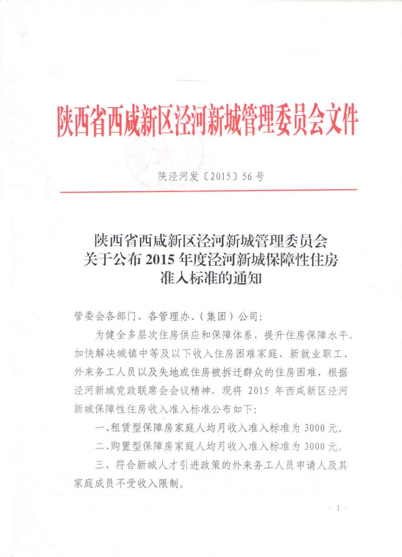 关于公布2015年度泾河新城保障性住房准入标准的通知