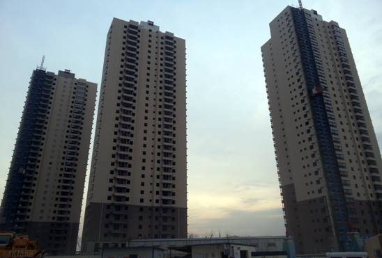 1号地块1#、2#、3#(从左向右),共计500套均主体封顶,给排水管道安装完成。