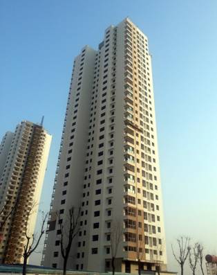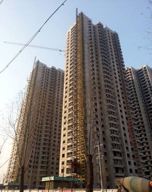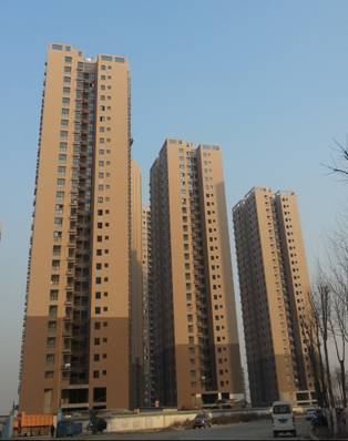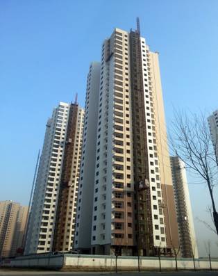 1号地块1#、2#、3#(从左向右),共计500套均主体封顶,进行阳台塑钢窗玻璃安装。
