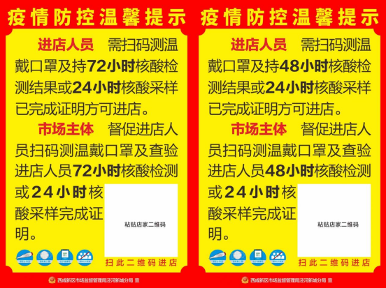 二是印制温馨提示,加大宣传力度。分局积极落实常态化疫情防控措施,印制疫情防控市民、市场主体温馨提醒及要求宣传册,针对进店市民,要求其扫码、测温、戴口罩、持核酸检测结果或采样证明进店。针对市场主体,要求其落实主体责任,督促进店人员扫码、测温、一米线、戴口罩、查验核酸结果。执法人员耐心开展政策宣传与引导,挨家挨户将防疫要求传达到位,督促市场主体将温馨提示张贴门口明显位置。