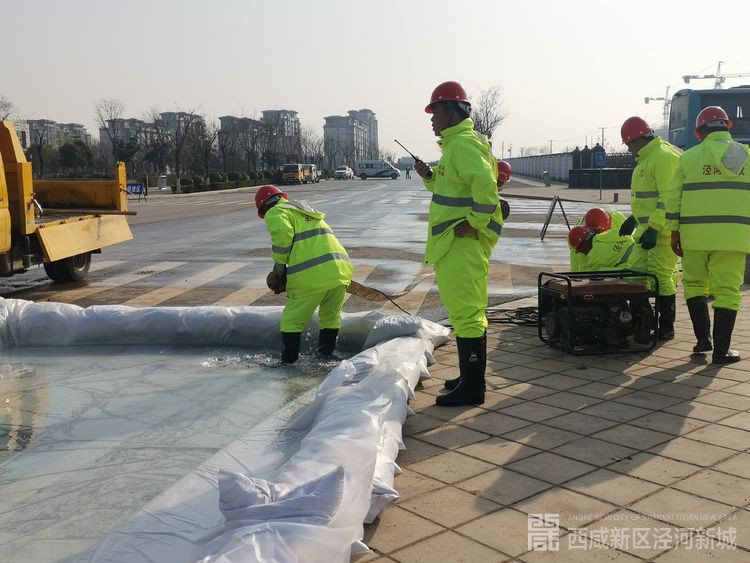 为提高泾河新城防汛处置水平,有效预防、及时有序处理连续强降雨引发的拥堵和安全事故,确保人民群众的生命财产安全,3月4日早上,城管交通局组织市政公司在崇文塔南广场开展2021年市政道路防汛应急抢险演练。
