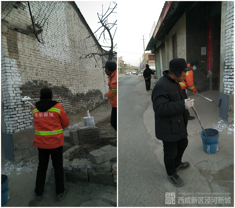 三河路整治小组组织保洁员统一粉刷美化两侧墙体。