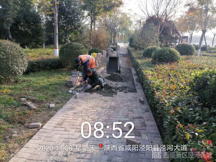 今日对正阳大道与泾河大道交汇处西北角铺装人行道及安装止车石15个;沣泾大道北铺设人行道砖15平方米,安装道牙石8米;沣泾大道西北角铺设人行道砖5平方米;泾阳县公路路政门口两边人行道更换破损透水砖约50平方米。