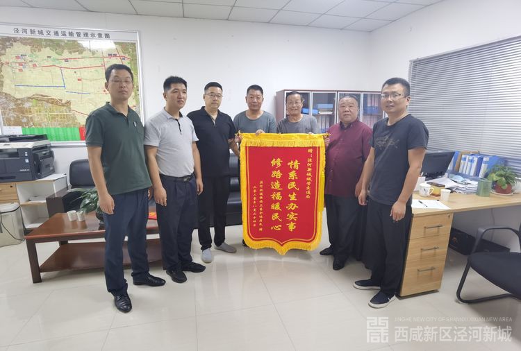 8月24日上午,泾河新城泾干街办西关村恒安三巷群众代表将一面写有“情系民生办实事 修路造福暖民心”的锦旗送到泾河新城城市管理与交通运输局,感谢他们为村内修建了致富路。