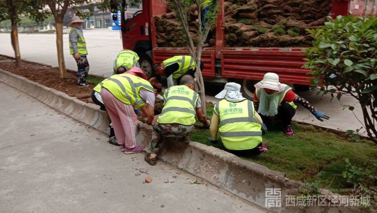 泾五路铺设草皮,并浇水养护
