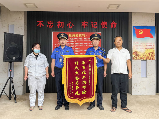 7月15日上午,泾河新城高庄镇费家崖村民雷娜和费周超将印有“扑烈火奋勇争先,为百姓不惧艰险”的锦旗送至综合行政执法支队执法队员手中,一面锦旗,十四个文字,虽简单却包含了老人一家对不顾自身安危奋力救火的执法人员的感谢之心。