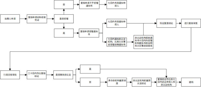 | 1 | 火灾事故认定和复核 | 《中华人民共和国消防法》第五十一条 消防救援机构有权根据需要封闭火灾现场,负责调查火灾原因,统计火灾损失。 火灾扑灭后,发生火灾的单位和相关人员应当按照机关消防救援机构的要求保护现场,接受事故调查,如实提供与火灾有关的情况。 消防机构根据火灾现场勘验、调查情况和有关的检验、鉴定意见,及时制作火灾事故认定书,作为处理火灾事故的证据。 《火灾事故调查规定》(公安部令第121号)第三十五条 当事人对火灾事故认定有异议的,可以自火灾事故认定书送达之日起十五日内,向上一级公安机关消防机构提出书面复核申请;对省级人民政府公安机关消防机构作出的火灾事故认定有异议的,向省级人民政府公安机关提出书面复核申请。 复核申请应当载明申请人的基本情况,被申请人的名称,复核请求,申请复核的主要事实、理由和证据,申请人的签名或者盖章,申请复核的日期。 | 消防救援大队 | 行政复核 | |