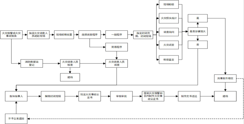 4、火灾发生后及时赶赴火灾现场,根据现场勘验、调查询问和有关检验、鉴定意见等调查情况,及时作出起火原因的认定。
