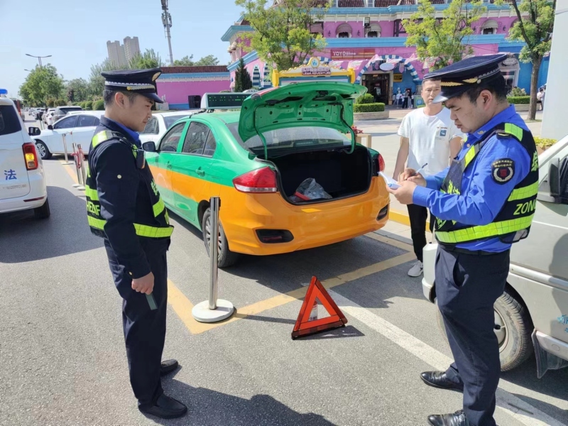 维护出租客运市场秩序,检查景区周边出租车辆,执法人员仔细检查从业人员资格证、三角架、灭火器,是否印有监督电话,确保规范运营,提升新城形象。