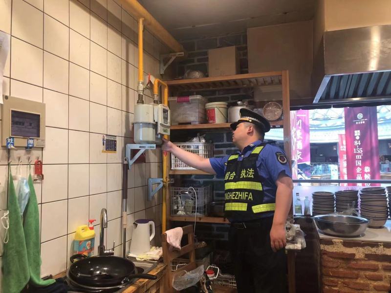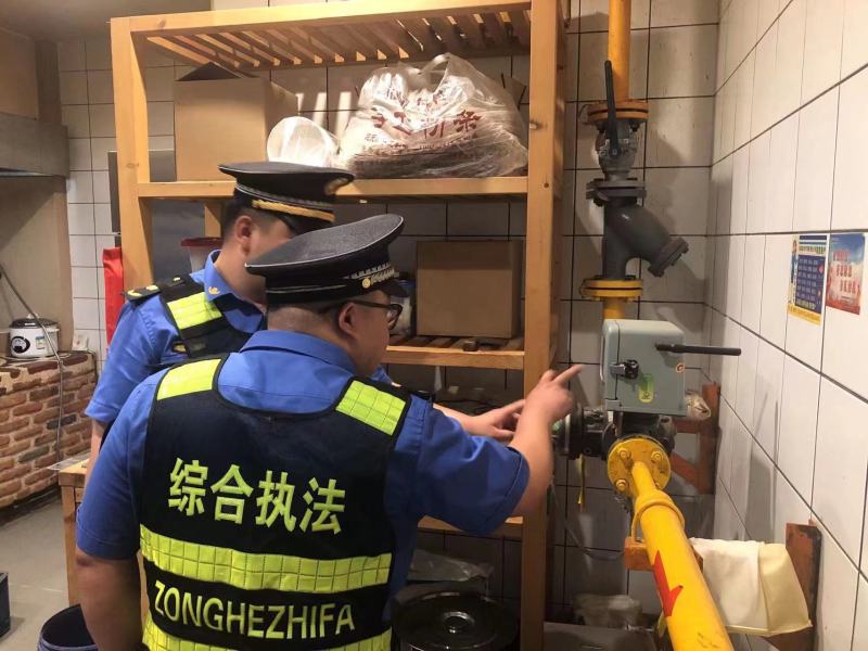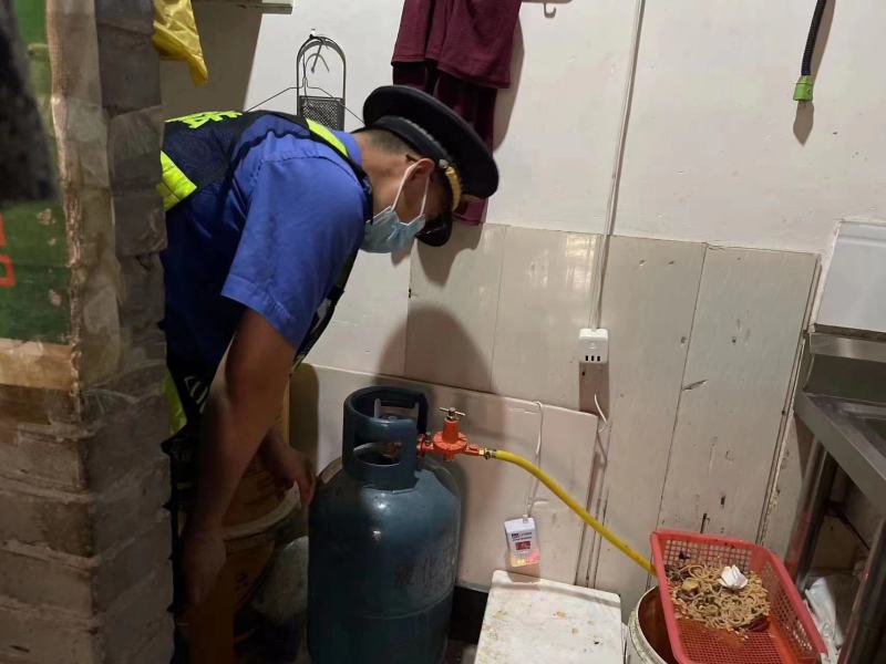开展燃气安全检查。进入夏季,燃气安全事故多发。执法队员深入辖区餐饮企业、餐饮摊位,对用气场所进行隐患排查。重点对燃气瓶暴晒、倒卧使用以及输气管道老化、腐蚀、过长、分头乱接等情况逐一排查,要求存在问题的店铺限期整改。除此之外,全面掌握瓶装燃气设施设备使用维护保养、消防设施配备等情况,从源头消除经营端用气隐患,保障群众用气安全。