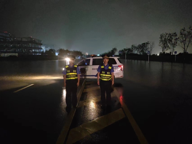 在强降雨过程中,执法人员冒着大雨,坚守岗位,对辖区内易积水区域、低洼地段、桥涵等重点部位加大巡查力度,对可能出现的隐患进行全面排查。同时,全程关注雨情、水情、汛情、路况信息,做好突发事件应急处置和重点部位风险排查,监控汛情;主动帮助遇险人员,保障人民群众生命财产安全。