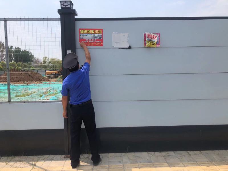 在整治巡查中,执法人员重点对辖区施工围挡是否存在结构受损,面板变形、污损,歪斜等现象进行巡查。对破损外翻、影响美观的施工围挡,联系施工单位负责人及时修复、更换。对存在安全隐患的施工围挡,责令施工单位做好防范措施,立即整改,并跟踪检查整改落实情况,确保安全牢固、整洁美观。对施工围挡上私设广告或公益广告残缺不全、设置不规范的,发现一处整改一处。