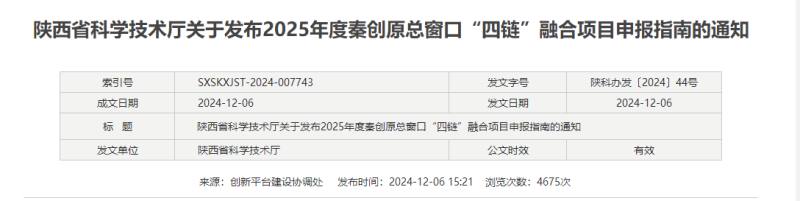 为贯彻落实省委、省政府部署要求和《秦创原创新驱动平台建设三年行动计划(2024—2026年)》,进一步提升秦创原总窗口示范带动作用,助推西安—咸阳创新驱动一体化发展和秦创原创新驱动平台建设升级扩能,根据年度工作安排,现启动2025年度秦创原总窗口“四链”融合项目申报工作。