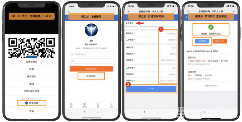 移动端:微信识别右侧二维码关注进入公众号,点击右下角【显摆招聘会】→【登录/注册】→点击微信图标→注册新账户→完成账号注册→选择【我是求职者】→完善个人简历→发布简历。