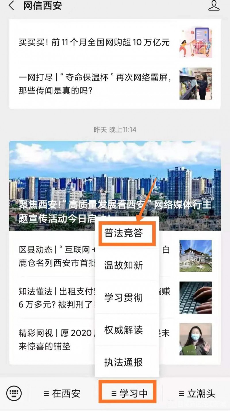 1.进入“网信西安”微信公众号,在底部菜单“学习中”点击“普法竞答”即可跳转至活动页面。