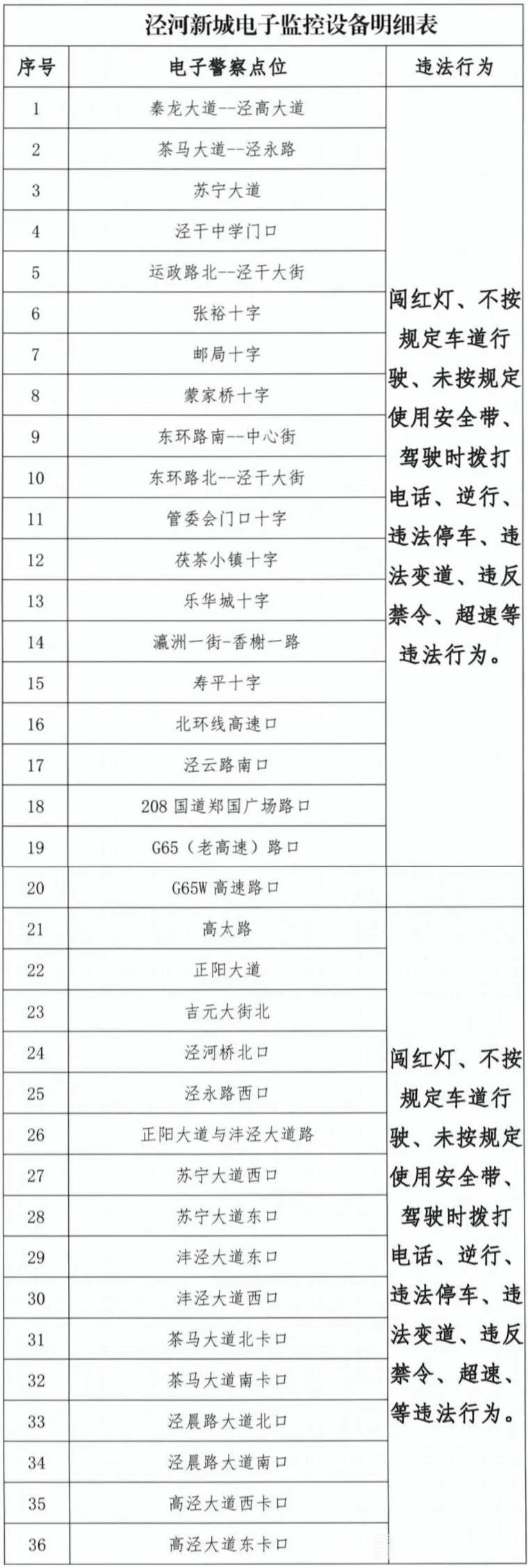 为维护泾河新城辖区道路交通安全秩序,预防和减少道路交通事故发生,提高道路通行效率。根据《中华人民共和国道路交通安全法》《中华人民共和国道路交通安全法实施条例》相关规定,结合本辖区道路交通管理工作实际,西咸新区公安局泾河新城分局在辖区范围内设置交通技术监控设备,现已建设完成并通过上级机关验收,经批准于2021年元月05日00时起对泾河新城辖区机动车闯禁行、闯红灯、逆行、违法变道、不按规定车道行驶、未按规定使用安全带、违法停车、超过规定限速等违法行为进行抓拍,对抓拍到的违法车辆将依照《道路交通安全违法行为处理程序规定》依法进行处理,特此公告。