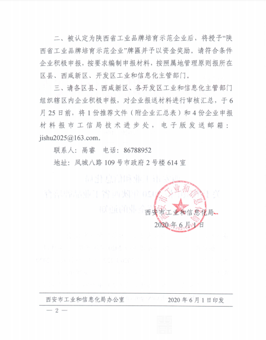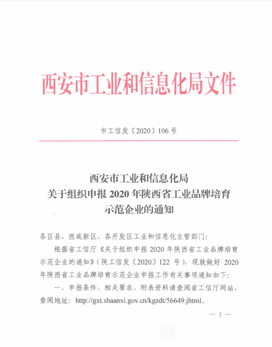 现将《关于组织申报2020年陕西省工业品牌培育示范企业的通知》转发给你们,请相关企业按通知要求积极申报,并于6月22日上午12:00前将申报资料(一式6份)报新城科创局。