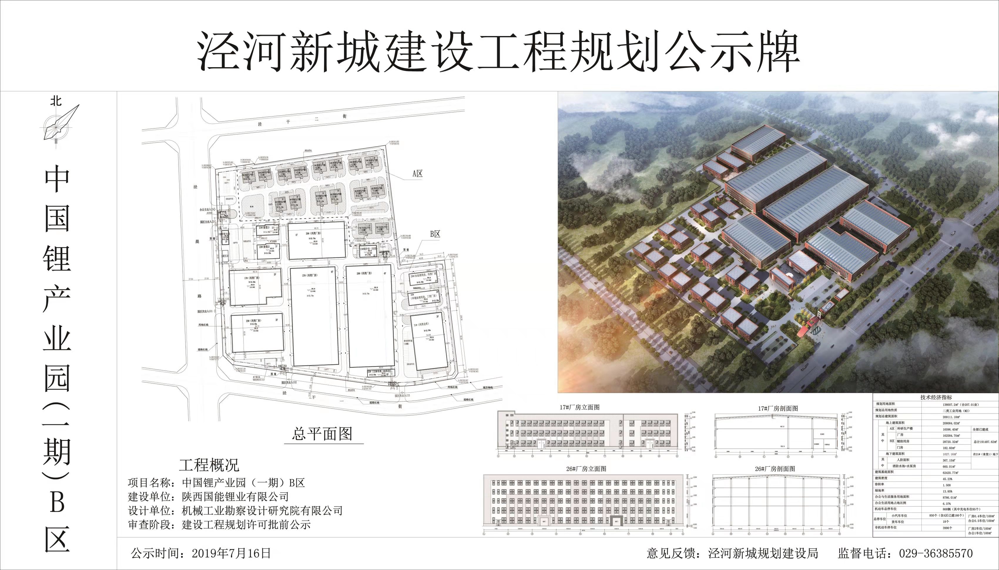关于陕西国能锂业有限公司上报的中国锂产业园项目(一期)B区已通过建筑设计方案审查,现进行建设工程规划许可批前公示,公示期2019年7月16日至2019年7月22日。如有异议,公示期内向规划建设局反馈,监督电话029-36385570。