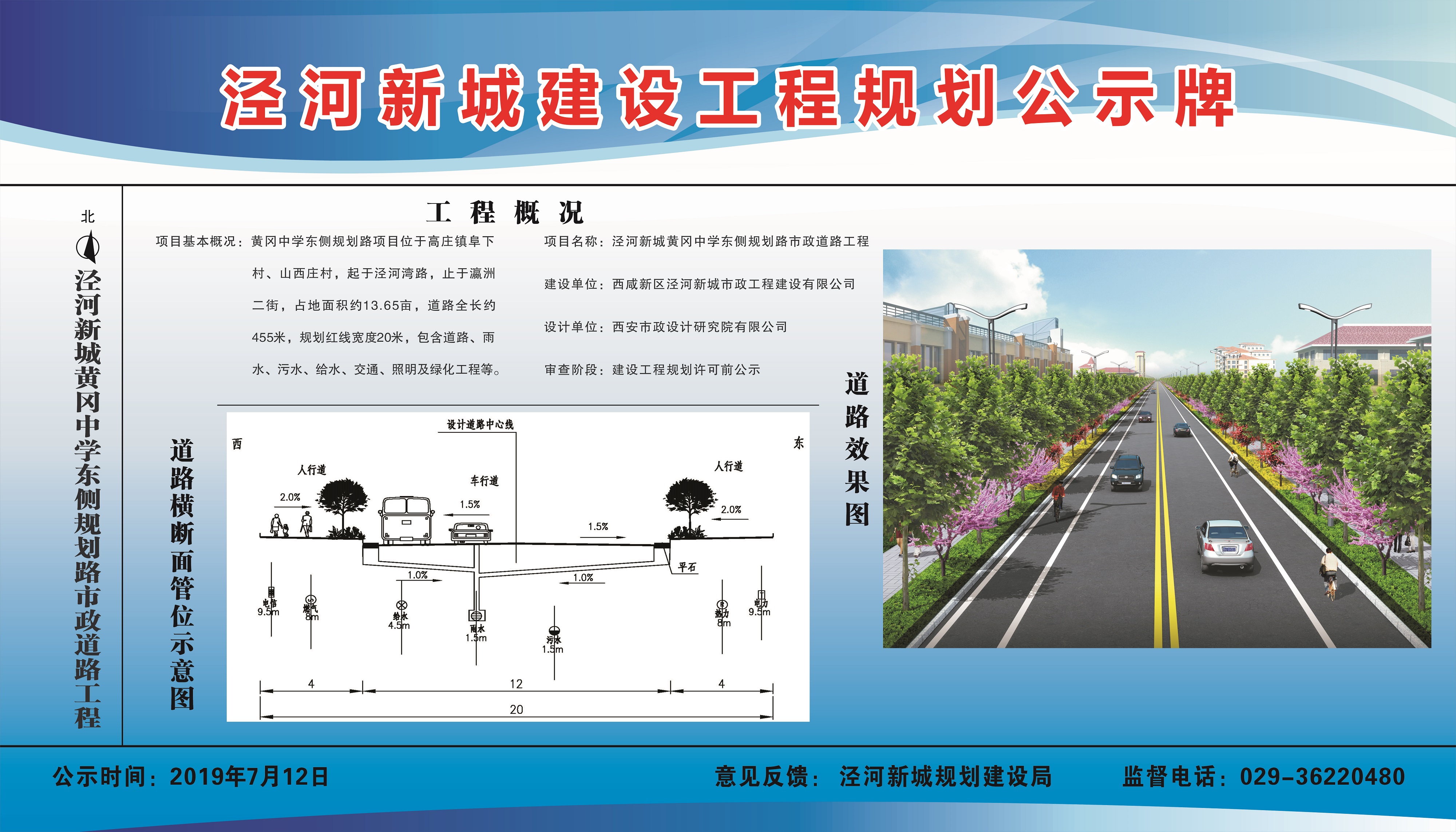 泾河新城黄冈中学东侧规划路市政道路工程项目已通过设计方案审查,现进行建设工程规划许可批前公示,公示期2019年7月12日至2019年7月18日。如有异议,请于公示期内向规划建设局反馈,监督电话029-36385570。