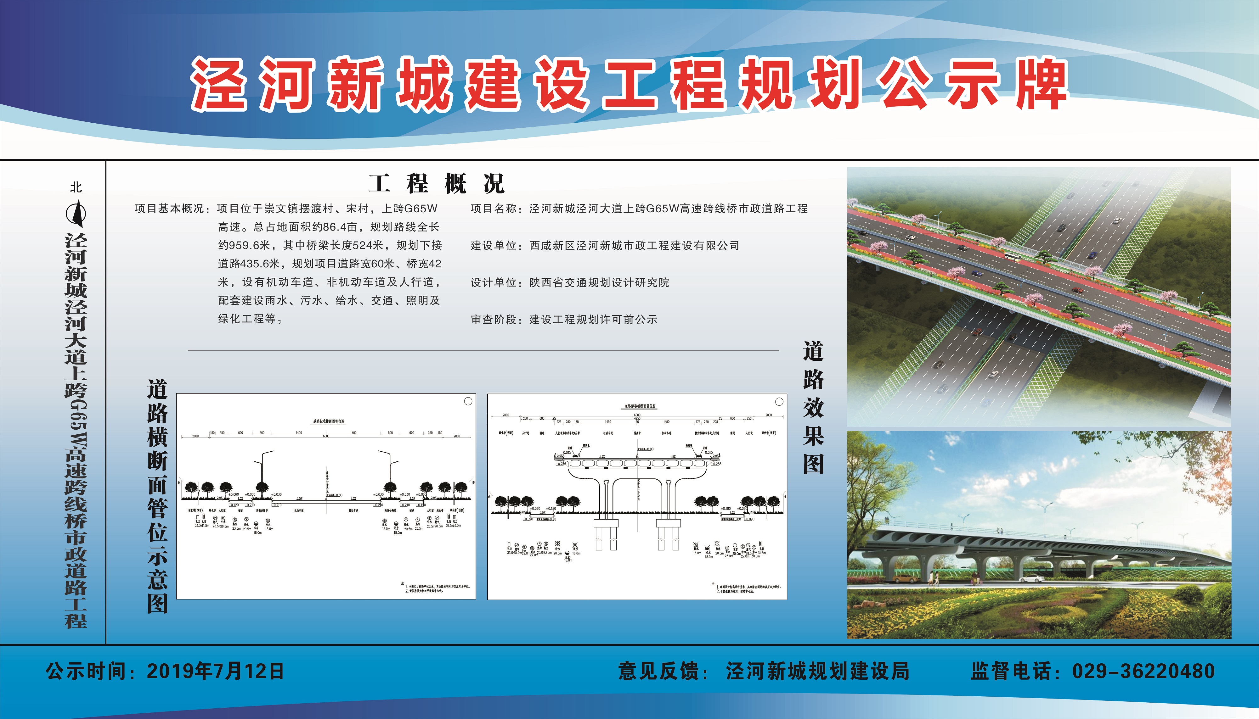 泾河新城泾河大道上跨G65W高速跨线桥市政道路工程项目已通过设计方案审查,现进行建设工程规划许可批前公示,公示期2019年7月12日至2019年7月18日。如有异议,请于公示期内向规划建设局反馈,监督电话029-36385570。