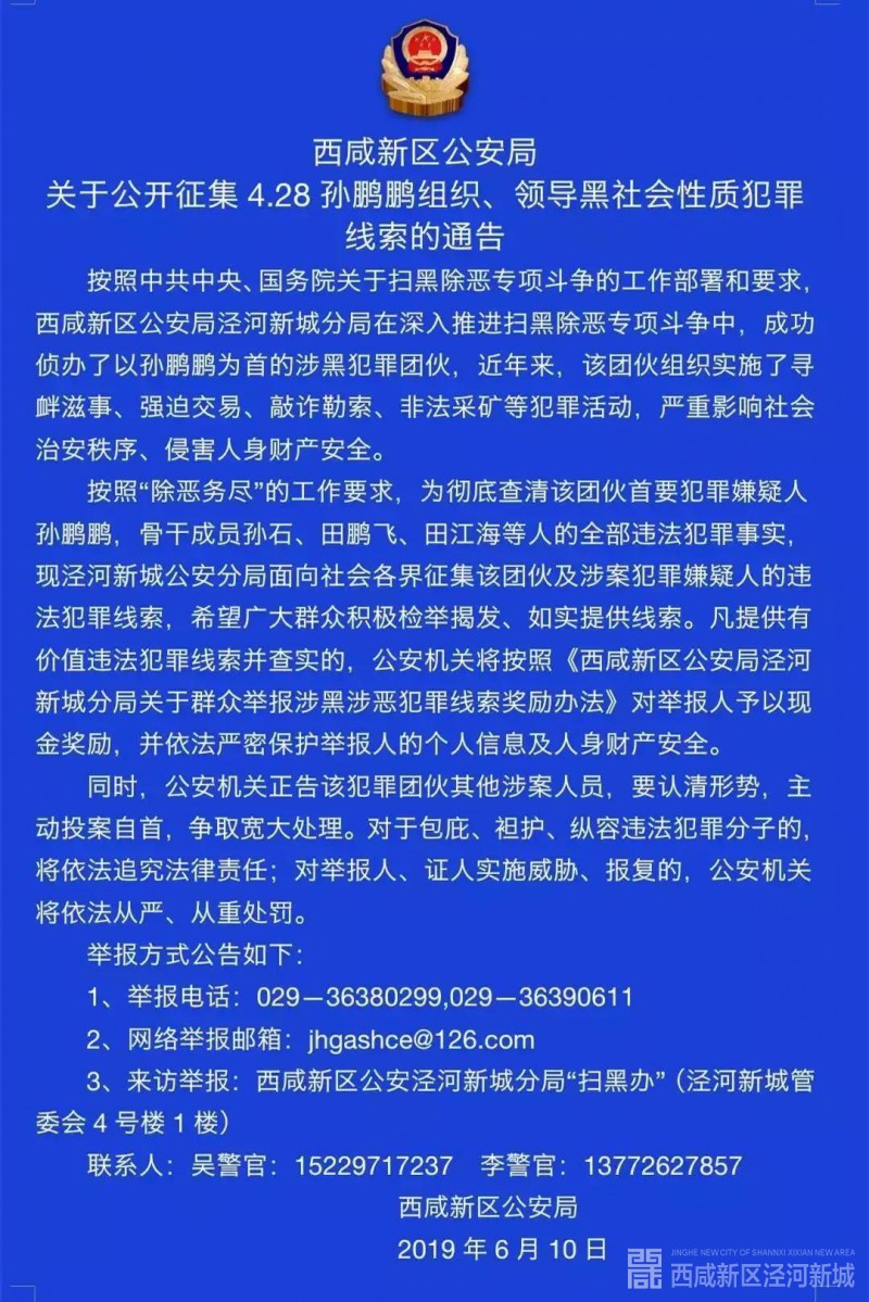 西咸新区公安局关于公开征集4.28孙鹏鹏组织、领导黑社会性质犯罪线索的通告