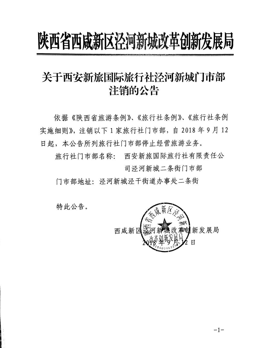 依据《陕西省旅游条例》、《旅行社条例》、《旅行社条例实施细则》,注销以下1家旅行社门市部,自2018年9月12日起,本公告所列旅行社门市部停止经营旅游业务。