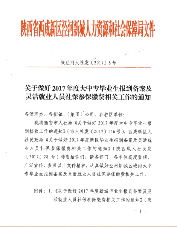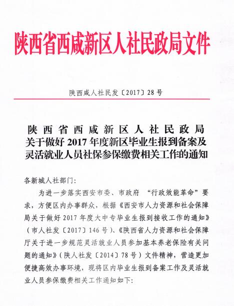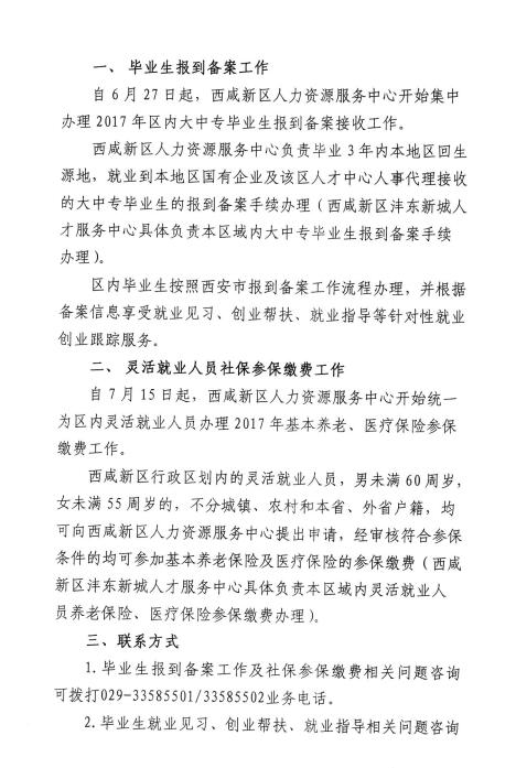 附件一:西咸新区人社民政局《关于做好2017年度新区毕业生报到备案及灵活就业人员社保参保缴费相关工作的通知》