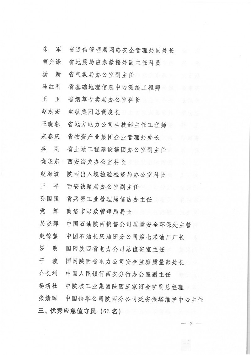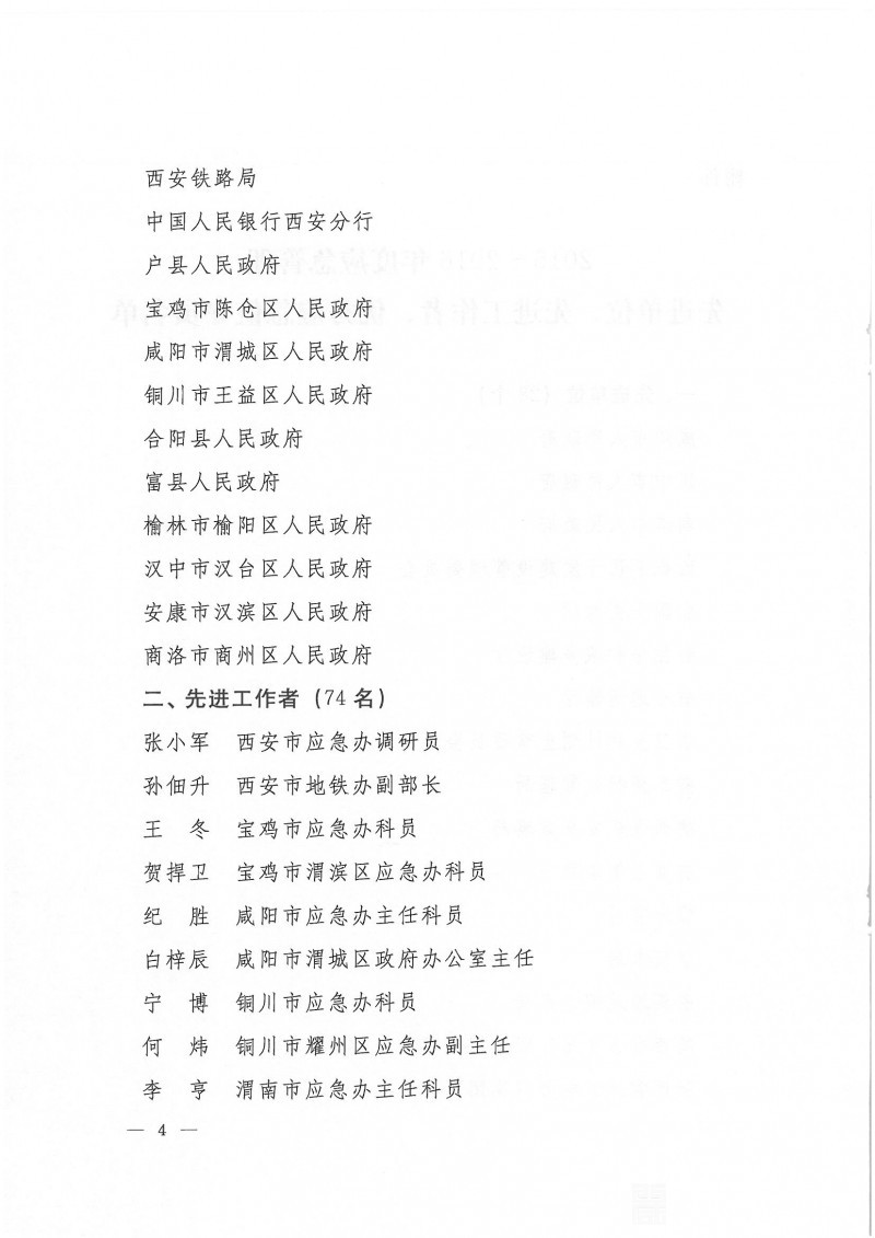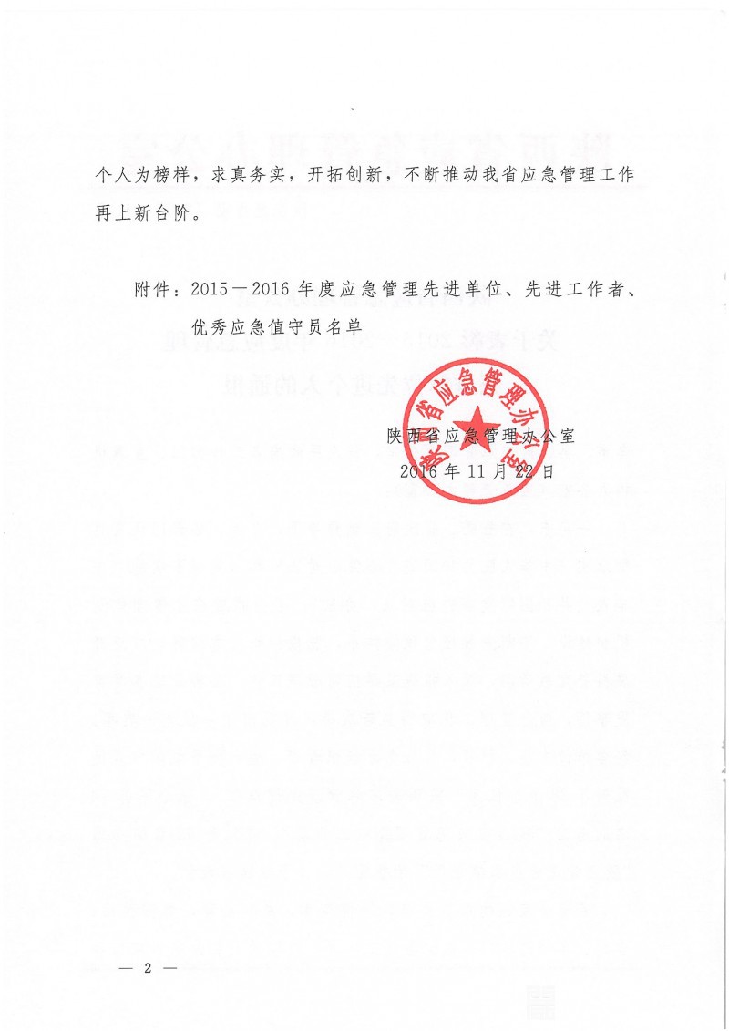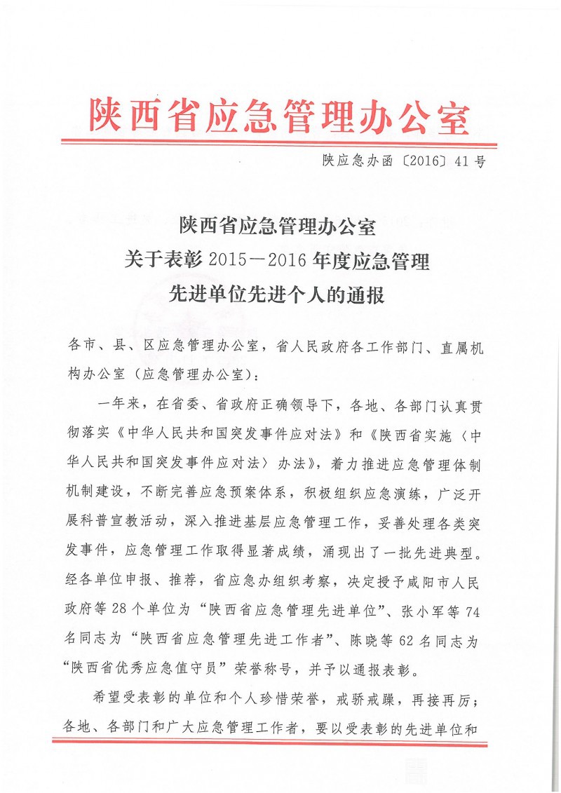 陕西省应急管理办公室关于表彰2015-2016年度应急管理先进单位先进个人的通报