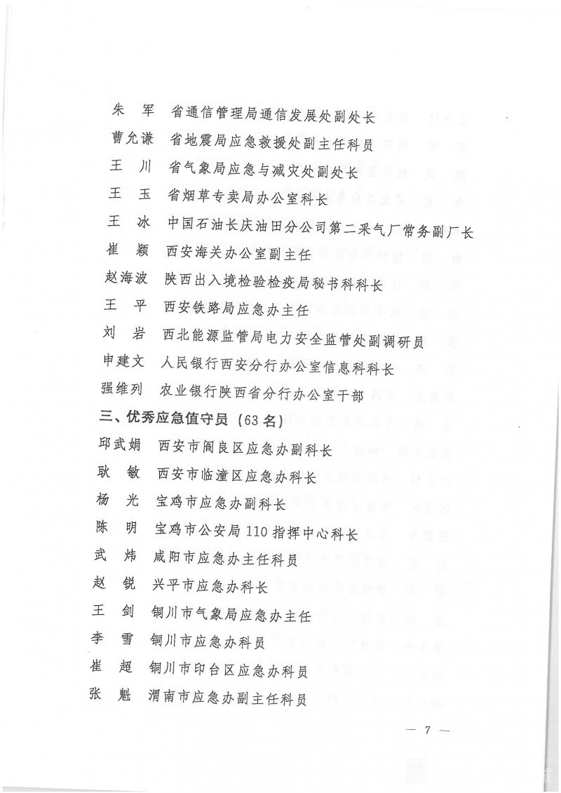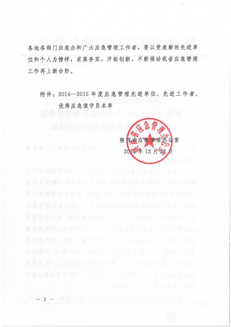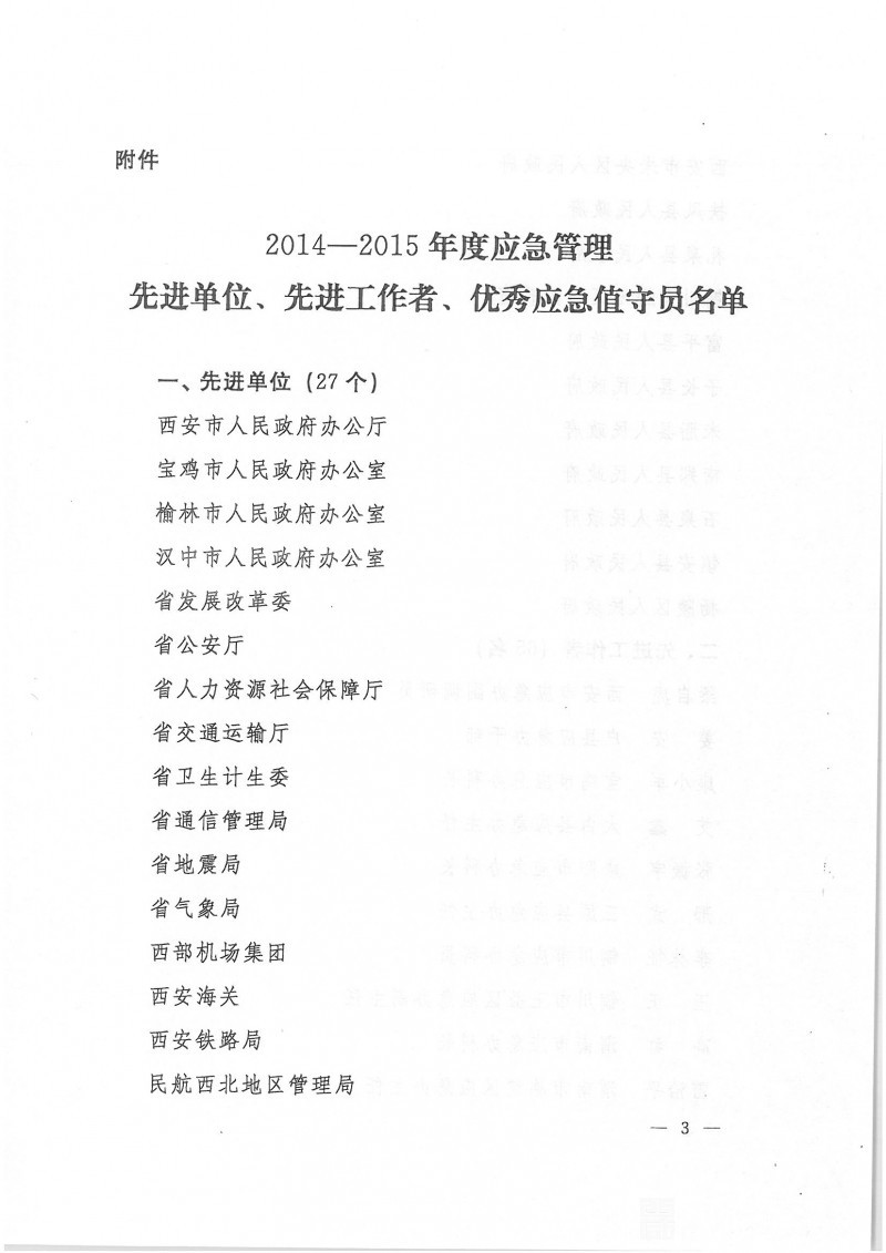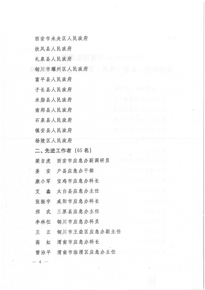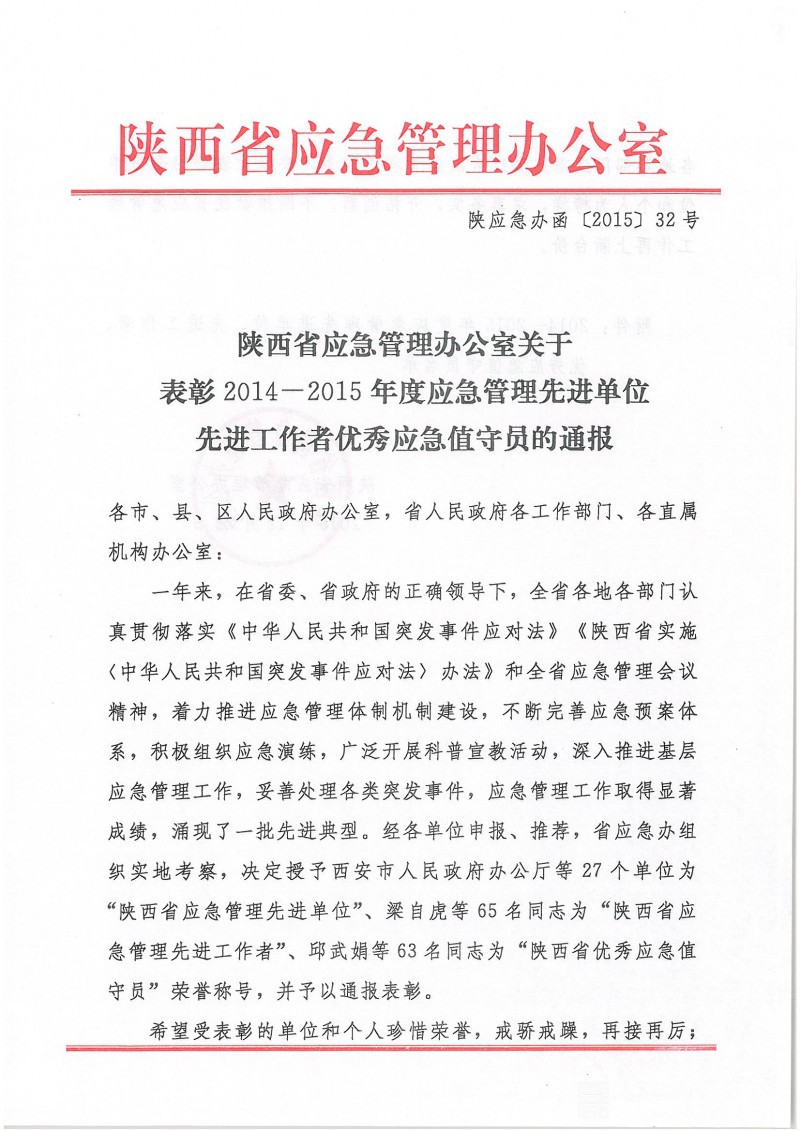 陕西省应急管理办公室关于表彰2014-2015年度应急管理先进单位先进工作者优秀应急值守员的通报