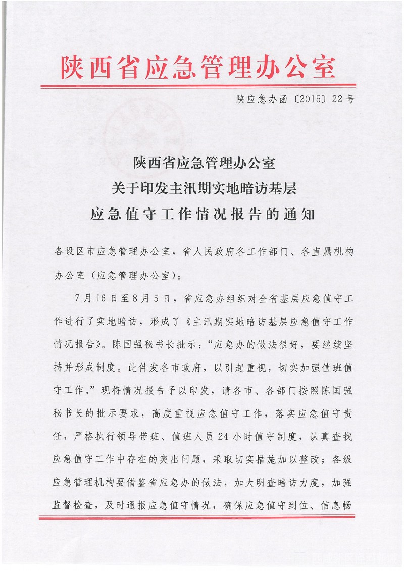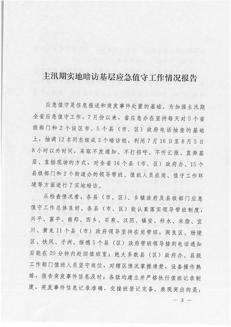 陕西应急管理办公室关于印发主汛期实地暗访基层应急值守工作情况报告的通知