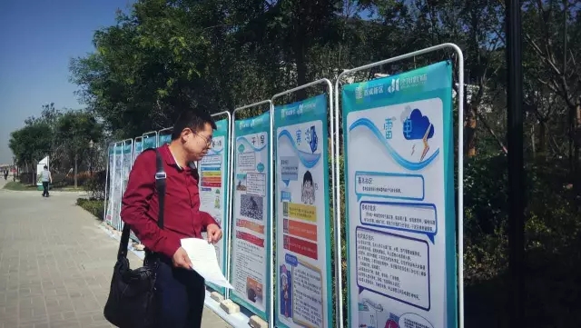 路人认真观看防灾减灾展板