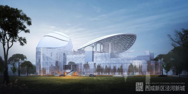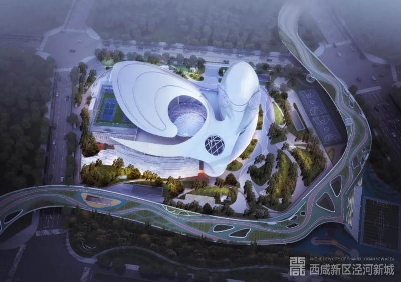 设计中的泾河体育中心外观由一块高达50米的竖起壳体和平铺壳体相组合,覆盖在由卵圆形、立方形所组成的主体建筑之上,形成了由西北自东南的弧形波浪组合,远眺似几个贝壳叠放构成的贝壳体,极具设计感、时尚感。